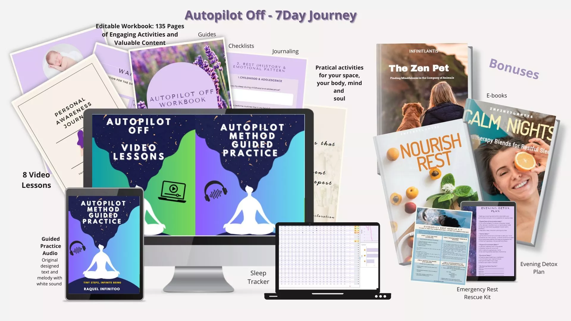 Autopilot Off: The 7-Day Journey to Rest, Release & Reconnection and all related materials, including videos, audio guides, meditations, and worksheets, are the intellectual property of Raquel Infinitoo.